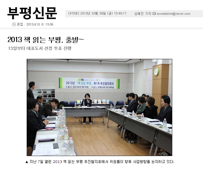 올해도 책 한 권이 부평구민들을 찾아간다. ‘2013년 책 읽는 부평 추진협의회’(이하 추진협의회)는 지난 7일 부개도서관 다목적실에서 첫 회의를 열고 향후 사업 방향을 논의했다. 아울러 올해 구민들이 함께 읽을 대표도서를 선정하기 위해 후보도서 3권을 뽑았다.