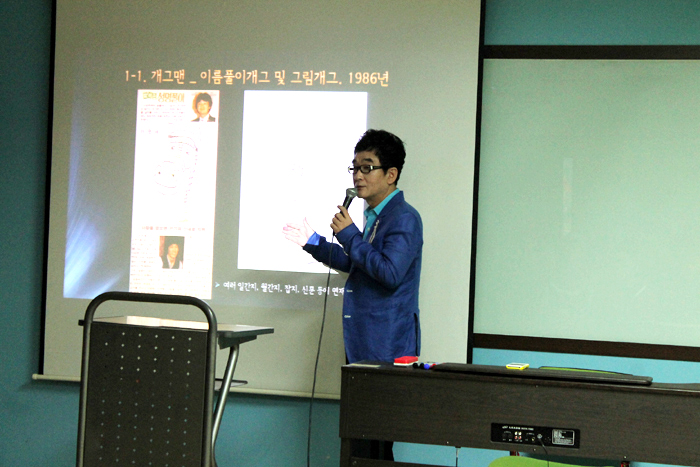 먼저, 박세민 겸임교수의 출연작을 보여주며 자신이 활용한 개그스타일에 대해서 소개해주셨어요.