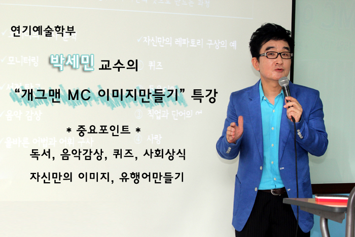 10월 15일(화)에는 연기예술학부 학생들에게 방송인으로서 준비해아하는 부분에 대한 박세민 겸임교수의 특강이 있었습니다. 어떤 준비가 우리 학생들을 방송인을 넘어 유명MC로 자리잡게 해주는지에 대해 알아보았습니다.