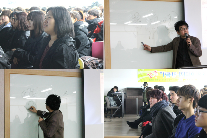 학생들의 눈은 동그랗게 되면서 신기한 눈빛으로 즉석에서 이름풀이 개그를 하시는 교수님을 신기하게 보았는데요. 그림 실력도 상당하신 교수님의 개그를 보며 연신 웃음을 연발하던 학생들의 모습이 잊혀지질 않네요~