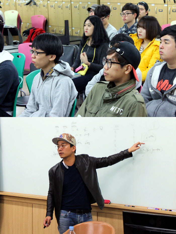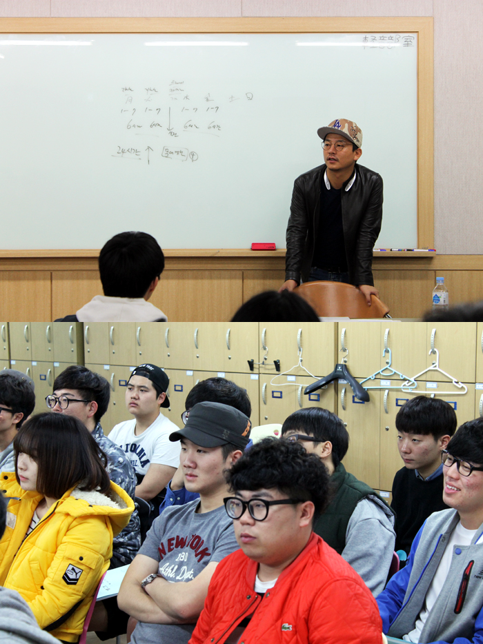 현재 김준호 교수가 출연하고 있는 개그콘서트의 개그맨들이 연습하는 시간, 연습 방식 등에 대해서 알려주며 아직 아마추어인 연기예술학부 학생들에게 절대 게을리해서는 안 되는 점들에 대해서 강조해주었습니다.