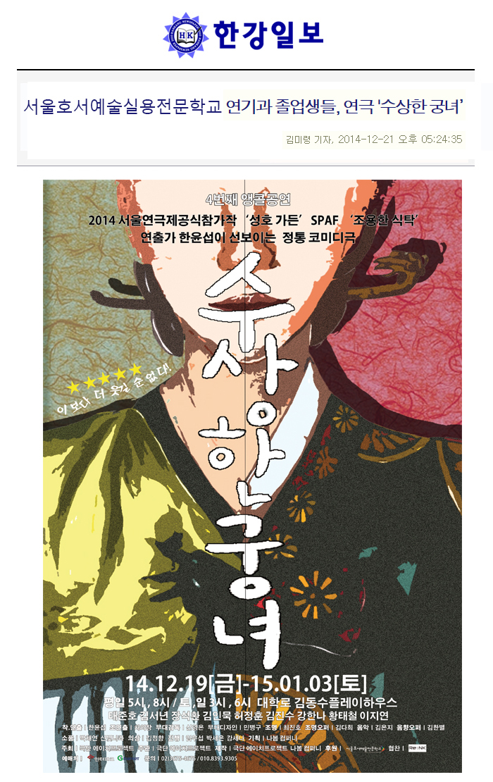 연극 '수상한궁녀'가 오는 2015년 1월3일까지 대학로 김동수플레이하우스 무대에 오른다.