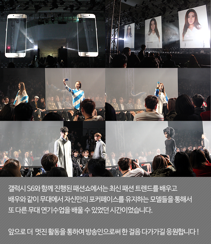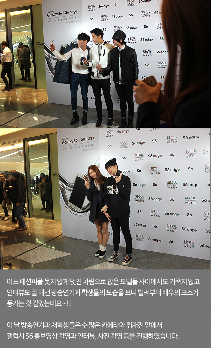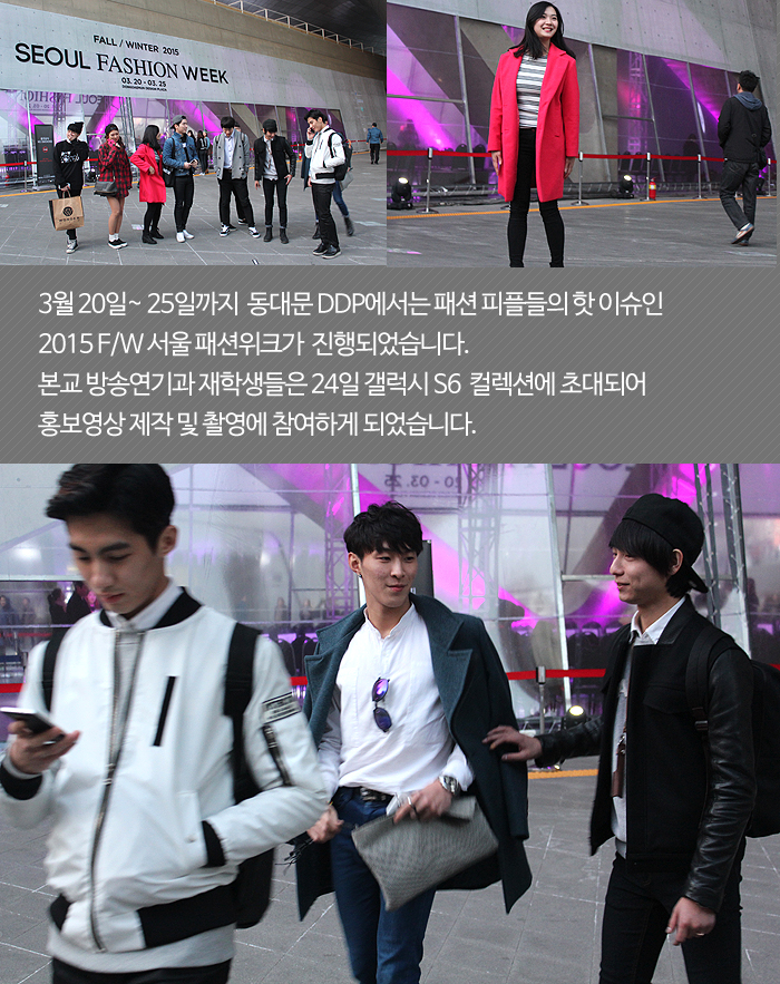 3월 20일부터 25일까지 동대문 DDP에서 진행되었던 서울 패션 위크에 방송연기과 학생들이 갤럭시 S6 컬렉션에 초대를 받아 홍보영상을 촬영, 제작하는 시간을 가졌습니다.