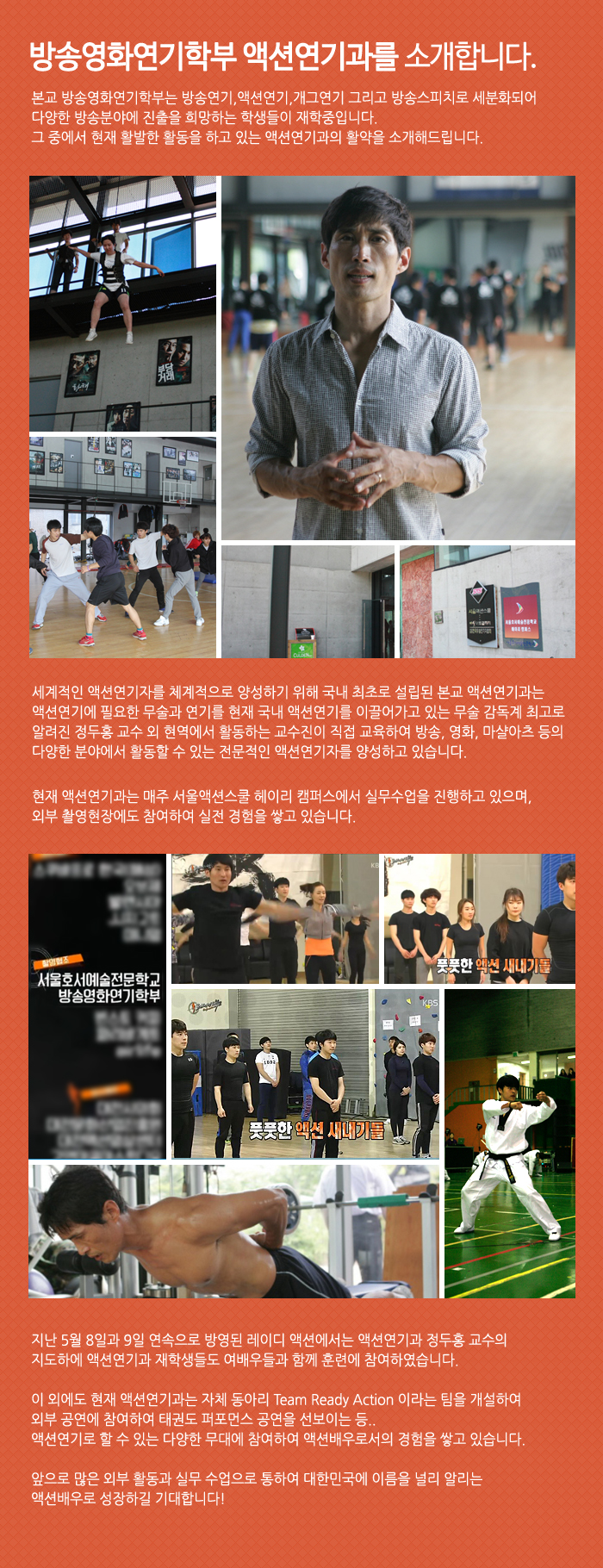 본교 방송영화연기학부는 방송연기,액션연기,개그연기 그리고 방송스피치로 세분화되어 다양한 방송분야에 진출을 희망하는 학생들이 재학중입니다.