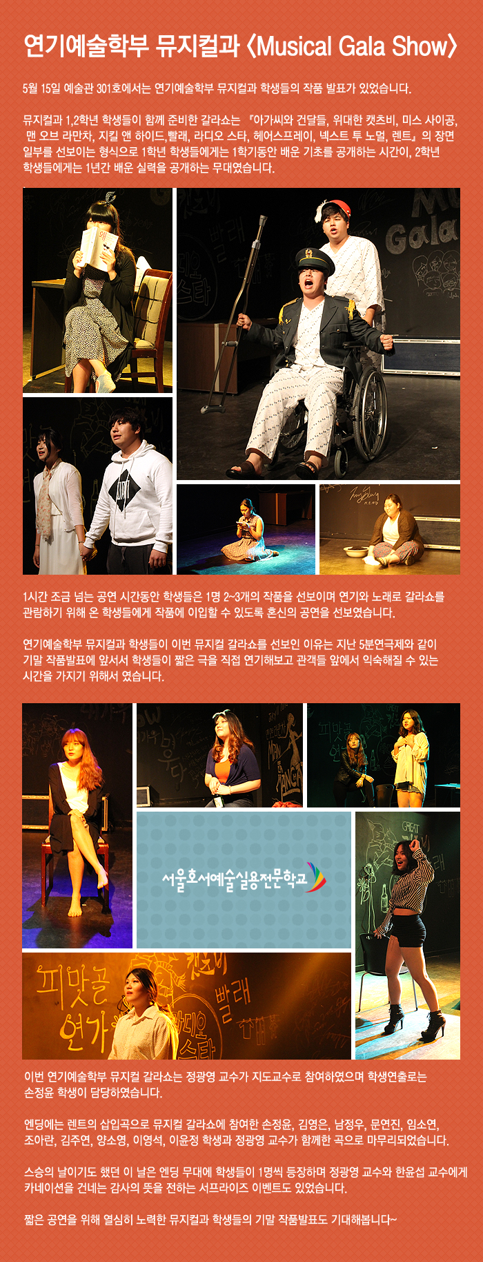 뮤지컬과 1,2학년 학생들이 함께 준비한 갈라쇼는 아가씨와 건달들, 위대한 캣츠비, 미스 사이공, 맨 오브 라만차, 지킬 앤 하이드,빨래, 라디오 스타, 헤어스프레이, 넥스트 투 노멀, 렌트의 장면의 일부를 선보이는 형식으로 1학년 학생들에게는 1학기동안 배운 기초를 공개하는 시간이었으며 2학년 학생들에게는 1년간 배운 실력을 공개하는 자리였습니다.