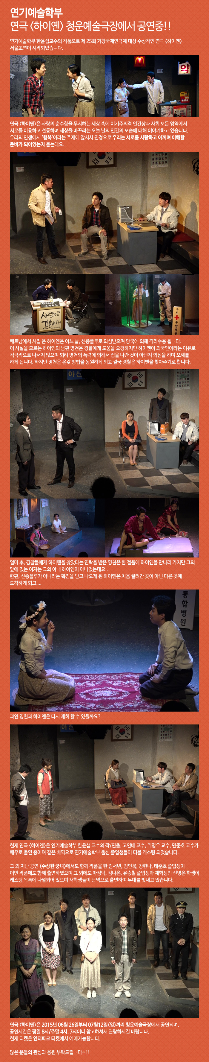 연기예술학부 한윤섭교수의 작품으로 제 25회 거창국제연극제 대상 수상작인 연극 <하이옌> 서울초연이 시작되었습니다.
