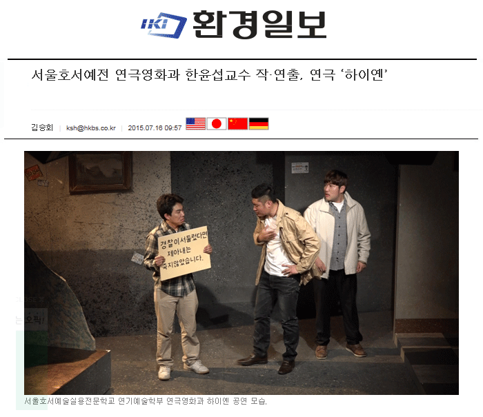 [환경일보] 김승회 기자 = 서울호서예술실용전문학교 연기예술학부 연극영화과의 한윤섭교수가 작, 연출 한 연극 ‘하이옌’이 6월26일에서 7월12일 까지 대학로 청운예술극장에서 공연됐다.