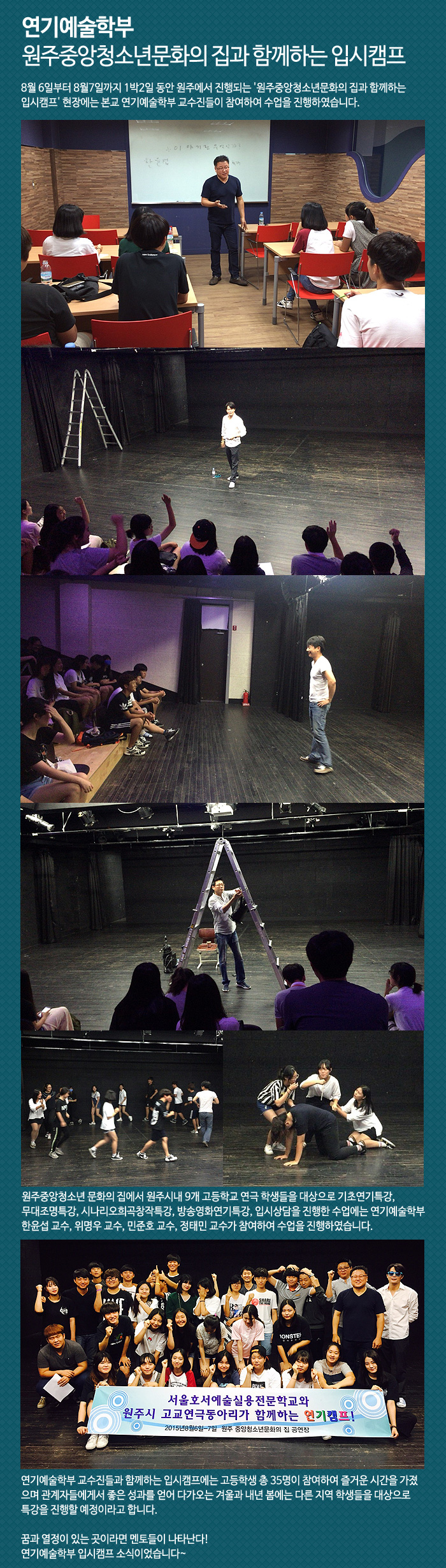 8월 6일부터 8월7일까지 1박2일 동안 원주에서 진행되는 '원주중앙청소년문화의 집과 함께하는 입시캠프' 현장에는 본교 연기예술학부 교수진들이 참여하여 수업을 진행하였습니다.