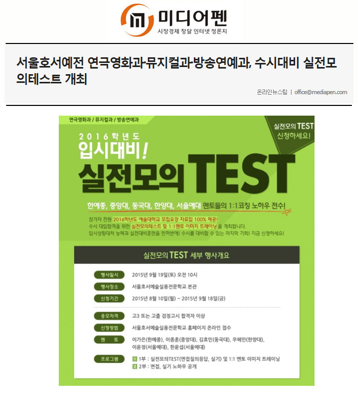 [미디어펜]연극영화과·뮤지컬과·방송연예과, 수시대비 실전모의테스트 개최