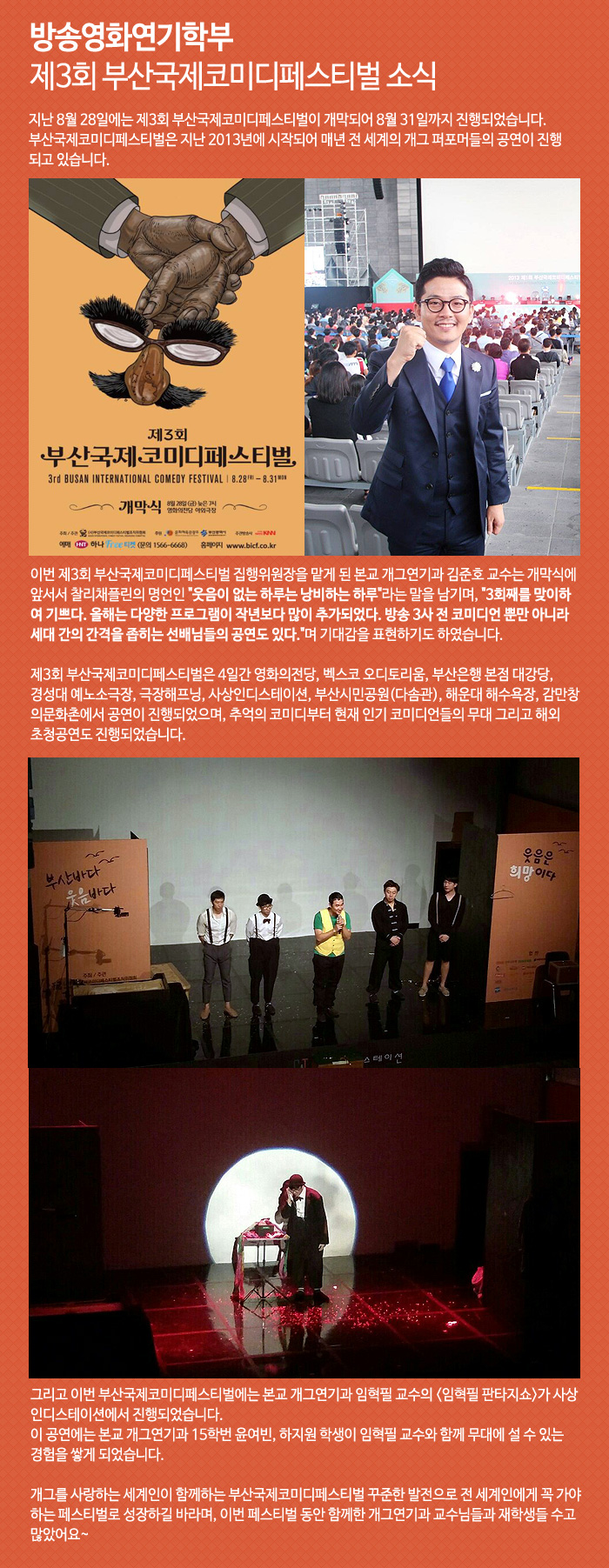 지난 8월 28일에는 제3회 부산국제코미디페스티벌이 개막되어 8월 31일까지 진행되었습니다.