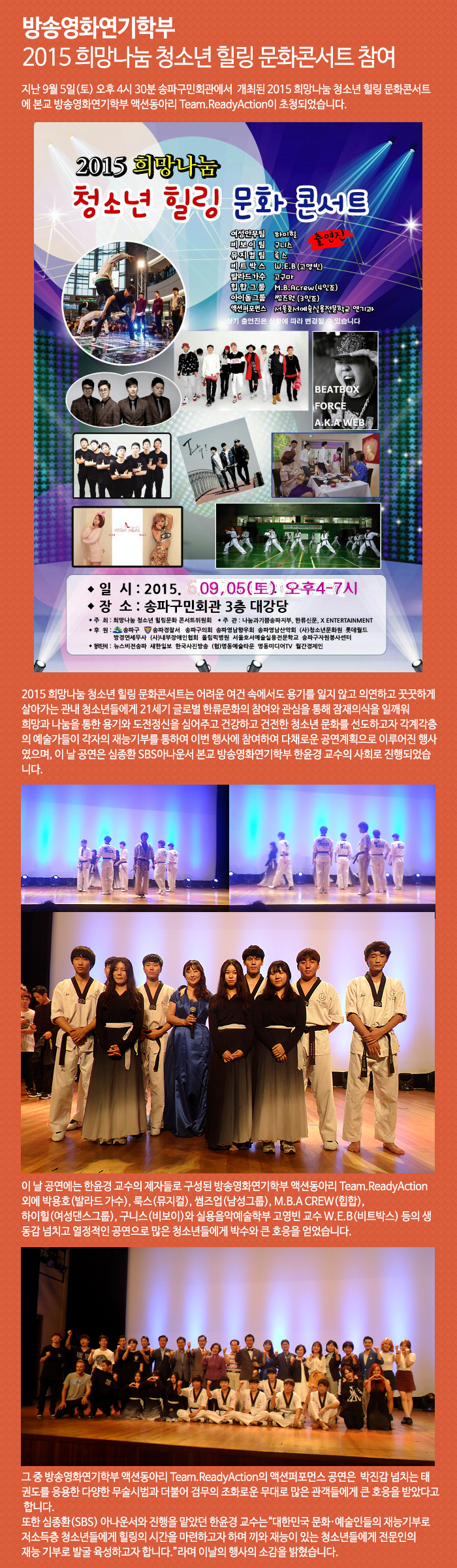 지난 9월 5일(토) 오후 4시 30분 송파구민회관에서 개최된 2015 희망나눔 청소년 힐링 문화콘서트에 본교 방송영화연기학부 액션동아리 Team.ReadyAction이 초청되었습니다.
