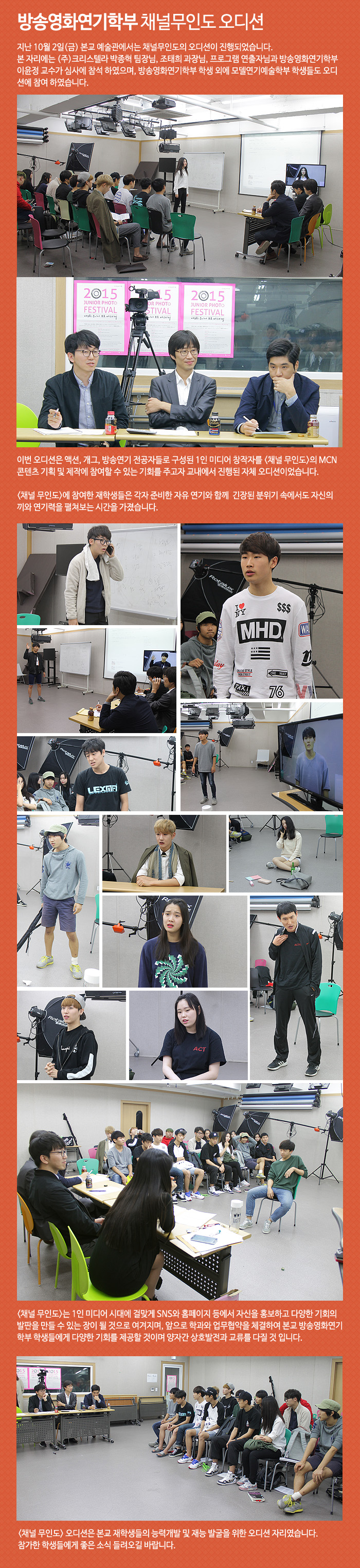 본 자리에는 (주)크리스텔라 박종혁 팀장님, 조태희 과장님, 프로그램 연출자님과 방송영화연기학부 이윤정 교수가 심사에 참석 하였으며, 방송영화연기학부 학생 외에 모델연기예술학부 학생들도 오디션에 참여 하였습니다.