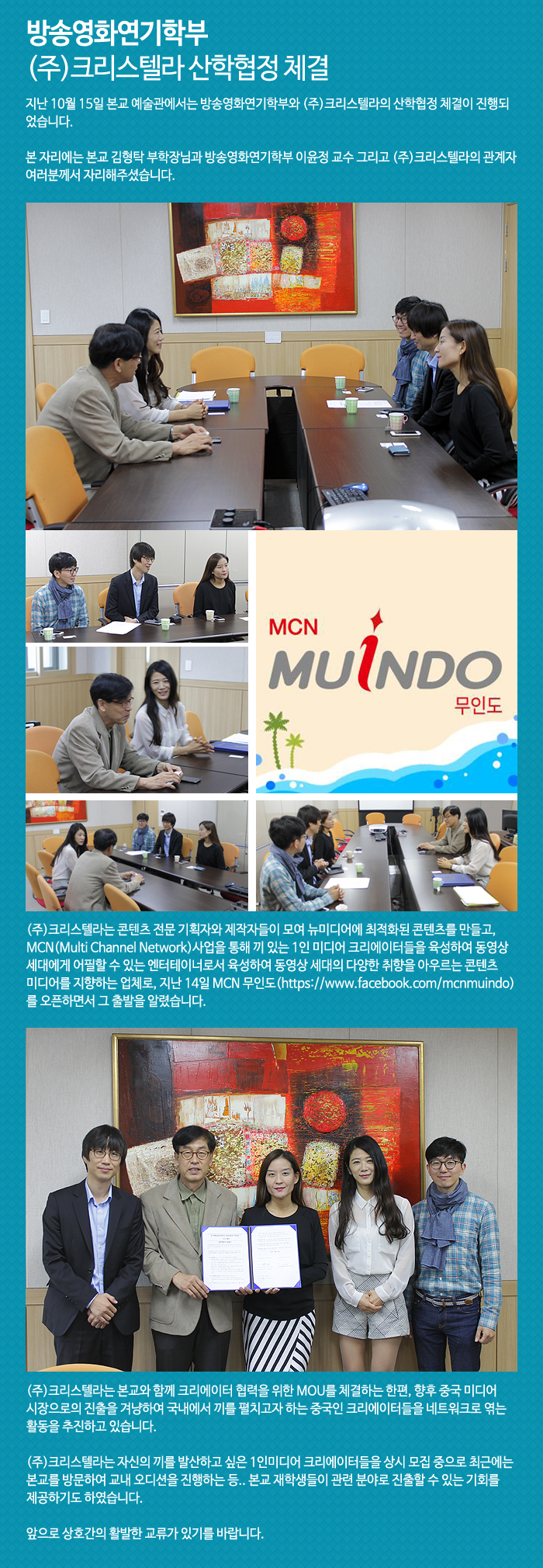지난 10월 15일 본교 예술관에서는 방송영화연기학부와 (주)크리스텔라의 산학협정 체결이 진행되었습니다.