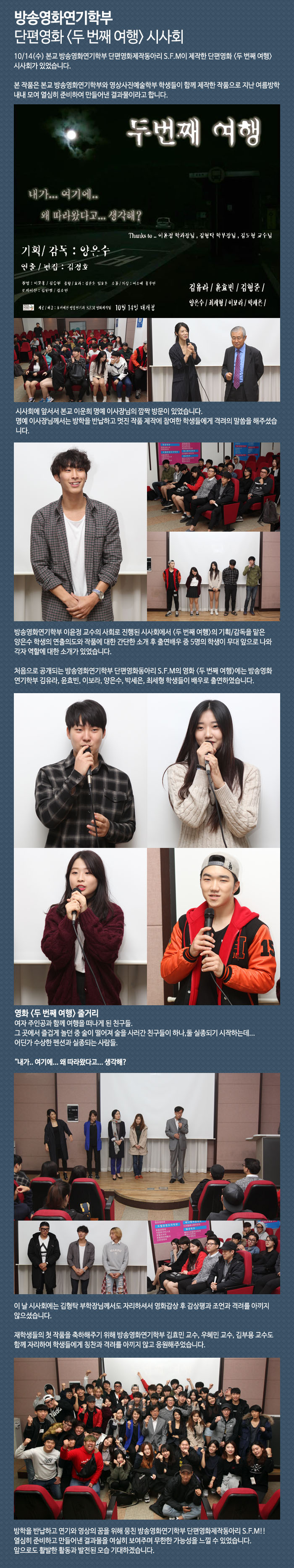 10/14(수) 본교 방송영화연기학부 단편영화제작동아리 S.F.M이 제작한 단편영화 <두 번째 여행>시사회가 있었습니다.
