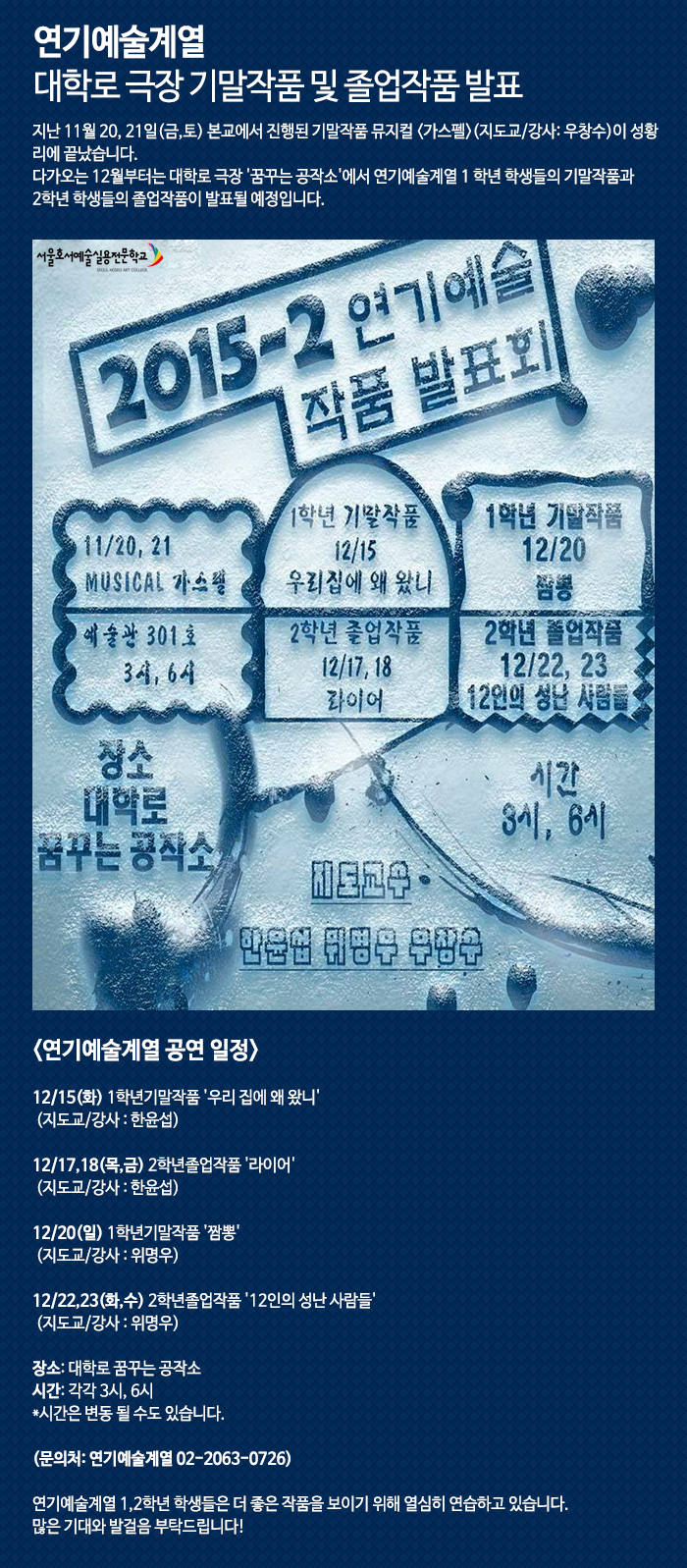 대학로 공연장인 '꿈꾸는 공작소'에서 기말작품과 졸업작품이 발표될 예정입니다.