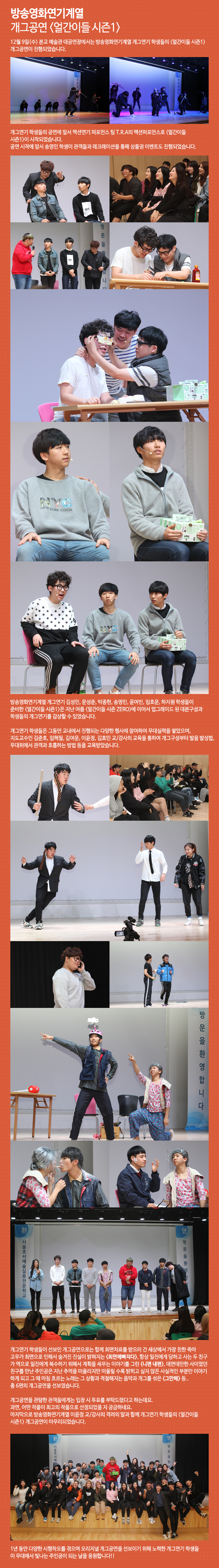 12월 9일(수) 본교 예술관 대공연장에서는 방송영화연기계열 개그연기 학생들이 준비한 <얼간이들 시즌1> 개그공연이 있었습니다.