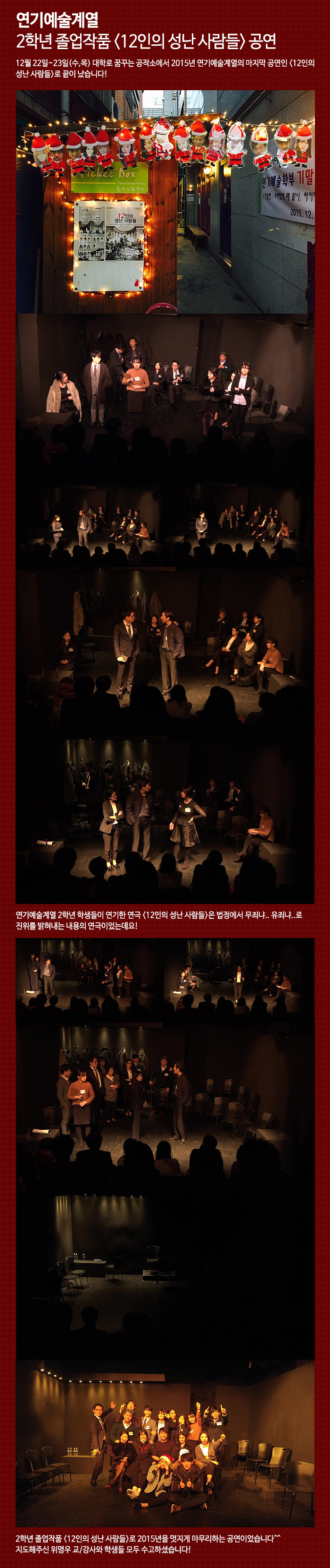 12월 22일~23일(수,목) 대학로 꿈꾸는 공작소에서 연기예술계열의 마지막 공연인 '12인의 성난 사람들' 로 2015년을 마무리하게 되었습니다!