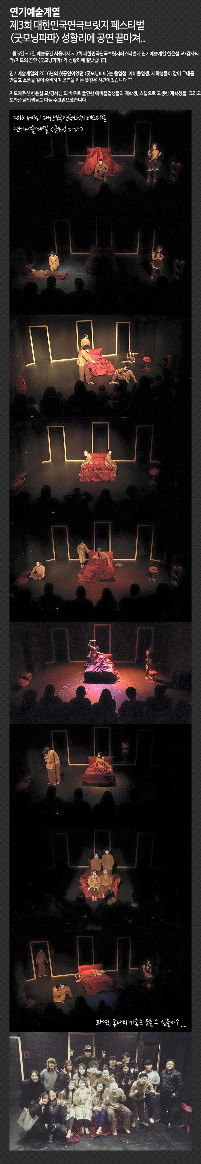 1월 5일 ~ 7일 예술공간 서울에서 제3회 대한민국연극브릿지페스티벌에 연기예술계열 한윤섭 교수 작/지도의 공연 '굿모닝파파' 가 성황리에 끝났습니다.