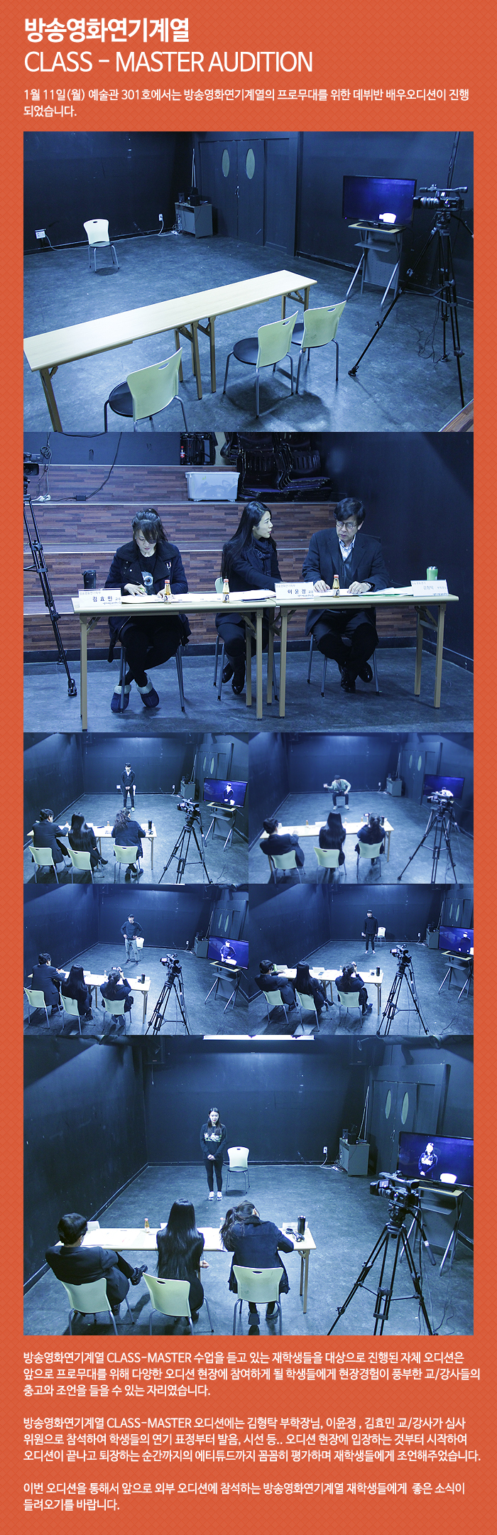 1월 11일(월) 예술관 301호에서는 방송영화연기계열의 프로무대를 위한 데뷔반 배우오디션이 진행되었습니다.