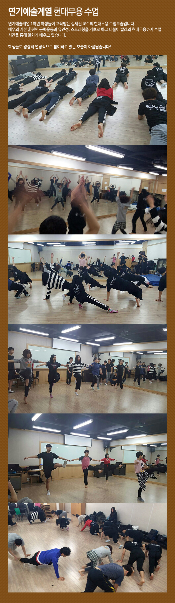 연기예술계열 1학년 학생들이 교육받는 김세진 교수의 현대무용 수업모습입니다.