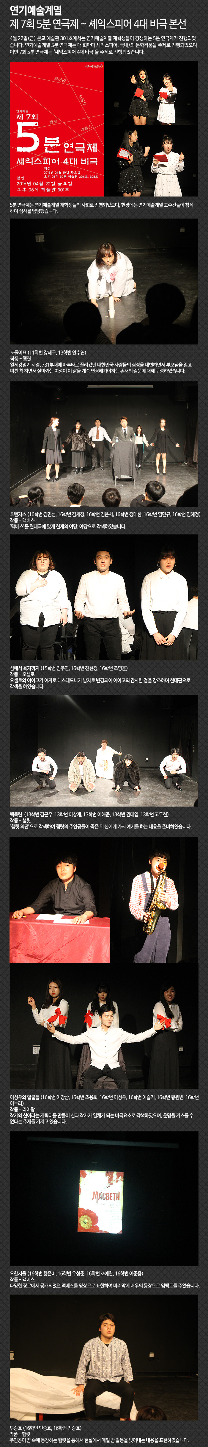 연기예술계열 5분 연극제는 매 회마다 셰익스피어, 국내/외 문학작품을 주제로 진행되었으며 이번 7회 5분 연극제는 ‘셰익스피어 4대 비극’을 주제로 진행되었습니다.