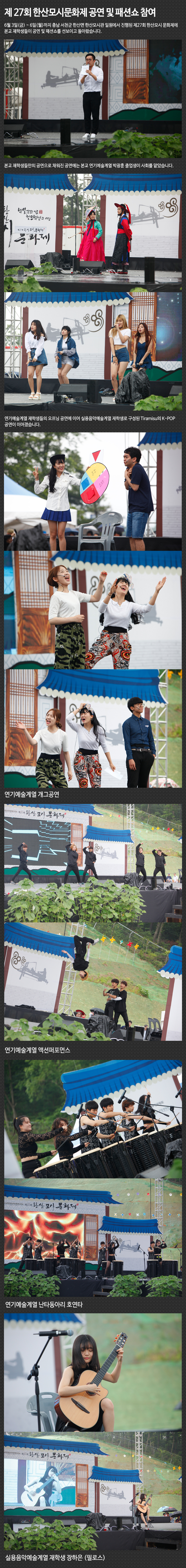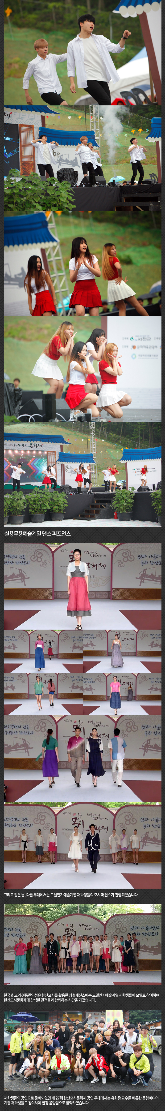 6월 3일(금) ~ 6일(월)까지 충남 서천군 한산면 한산모시관 일원에서 진행된 제27회 한산모시 문화제에 본교 재학생들이 공연 및 패션쇼를 선보이고 돌아왔습니다.