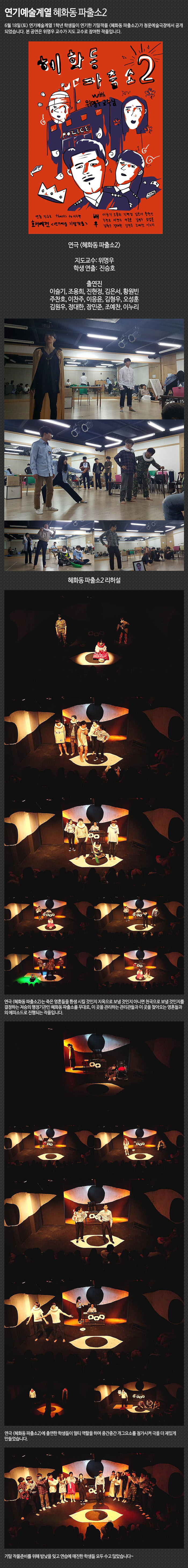 6월 18일(토) 연기예술계열 1학년 학생들이 연기한 기말작품 <혜화동 파출소2>가 청운예술극장에서 공개되었습니다. 본 공연은 위명우 교수가 지도 교수로 참여한 작품입니다.