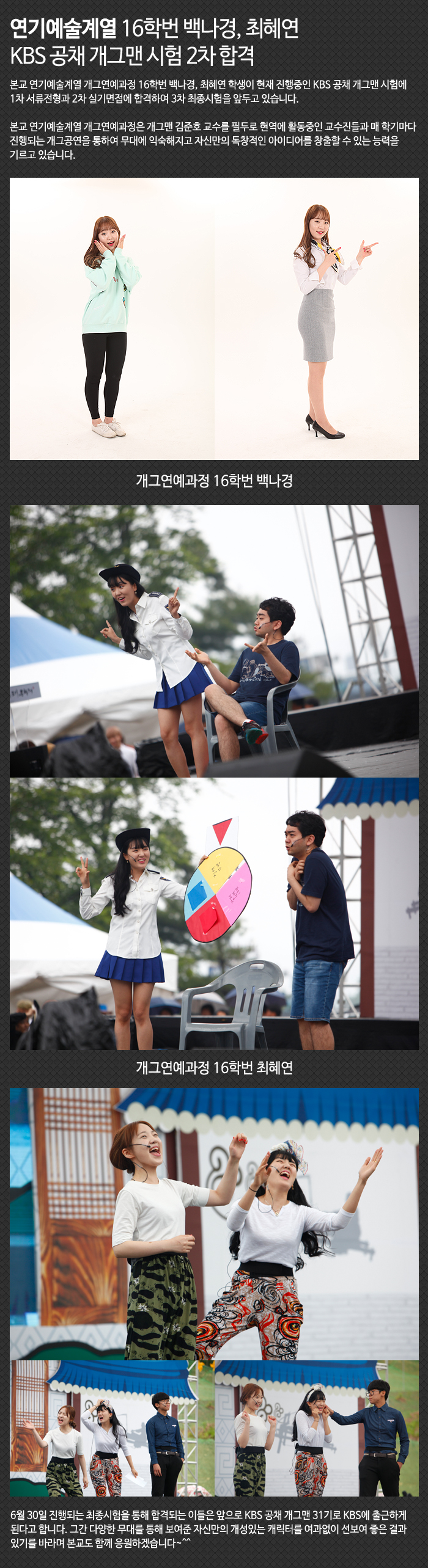 본교 연기예술계열 개그연예과정 16학번 백나경, 최혜연 학생이 현재 진행중인 KBS 공채 개그맨 시험 1차 서류전형과 2차 실기면접에 합격하여 3차 최종시험을 앞두고 있습니다.