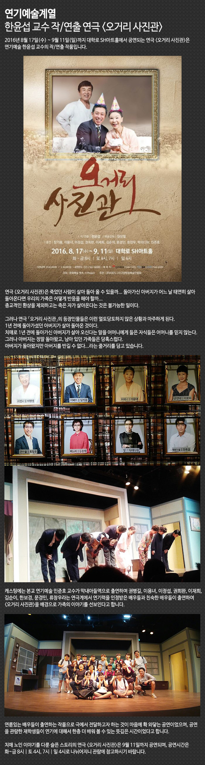 2016년 8월 17일(수) ~ 9월 11일(일)까지 대학로 SH아트홀에서 공연되는 연극 <오거리 사진관>은 연기예술계열 한윤섭 교수의 작/연출 작품입니다.