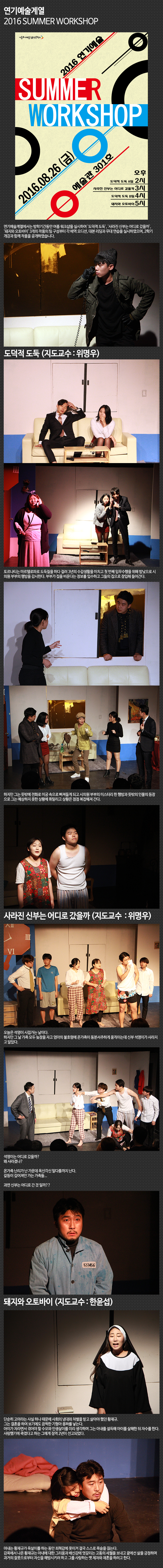 연기예술계열에서는 방학기간동안 여름 워크샵을 실시하여 '도덕적 도둑', '사라진 신부는 어디로 갔을까', '돼지와 오토바이' 3개의 작품의 팀 구성부터 각 배역 오디션, 대본 리딩과 무대 연습을 실시하였으며, 2학기 개강과 함께 작품을 공개하였습니다.