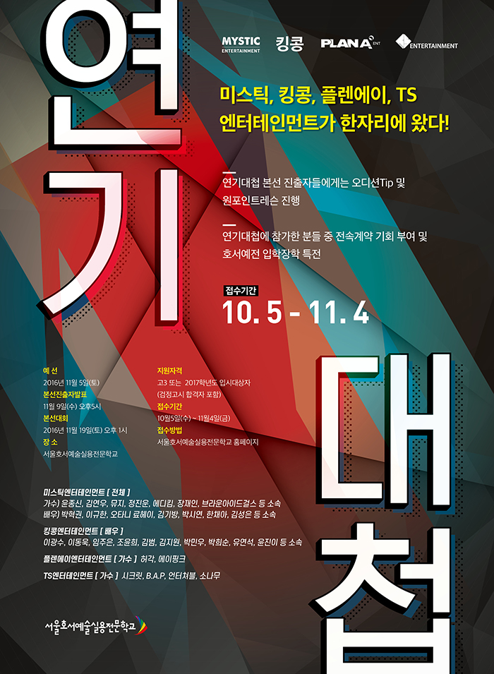 미스틱엔터테인먼트, 킹콩엔터테인먼트, 플렌에이엔터테인먼트, TS엔터테인먼트가 한자리에! 연기대첩에 참가한 분들 중 전속계약 기회 부여 및 호서예전 입학장학특전의 혜택이 있습니다. 또한 본선 진출자들에게는 오디션Tip 및 원포인트레슨이 진행됩니다.