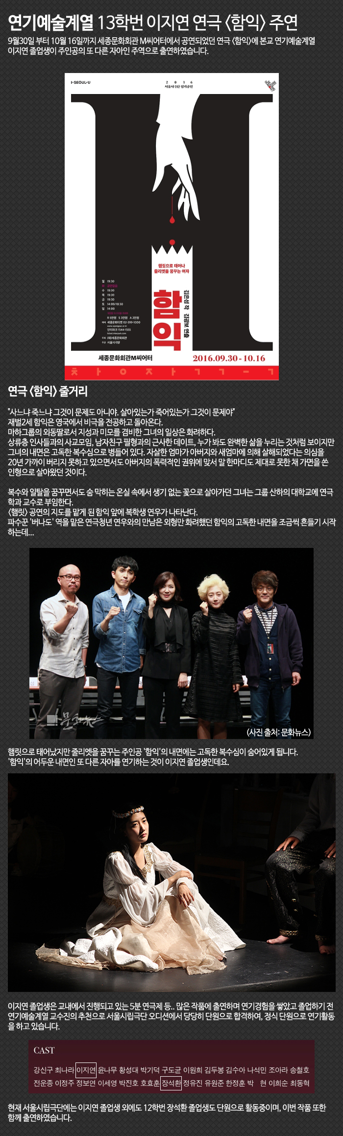 9월30일 부터 10월 16일까지 세종문화회관 M씨어터에서 공연되었던 연극 <함익>에 본교 연기예술계열 이지연 졸업생이 주인공의 또 다른 자아인 주역으로 출연하였습니다.