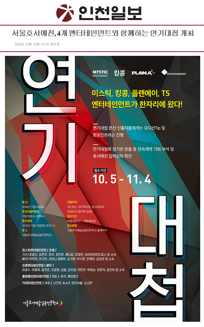 서울호서예술실용전문학교 연기과가 미스틱, 킹콩, 플렌에이, TS 엔터테인먼트와 함께하는 연기대첩 오디션을 개최한다.