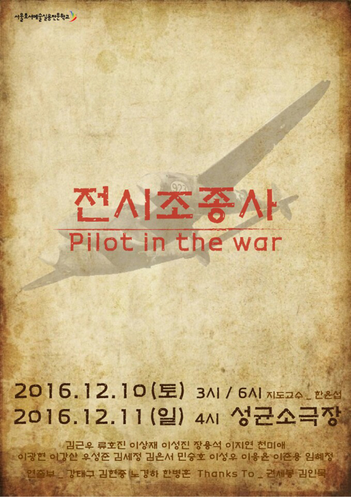 연기예술계열 1,2학년 학생들의 기말작품공연<전시조종사>가 12월 10일(토) 3시, 6시 12월11일(일) 오후 4시에 성균소극장에서 진행 됩니다.
