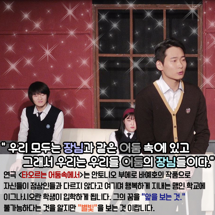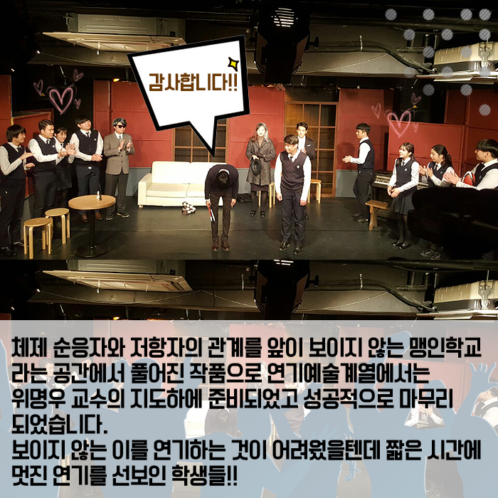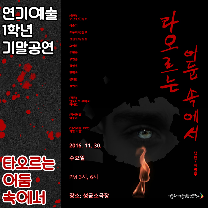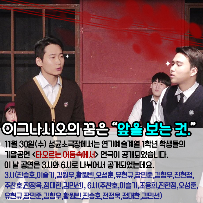 11월 30일(수) 성균소극장에서는 연기예술계열 1학년 학생들의 기말작품 <타오르는 어둠속에서>가 공개되었습니다.