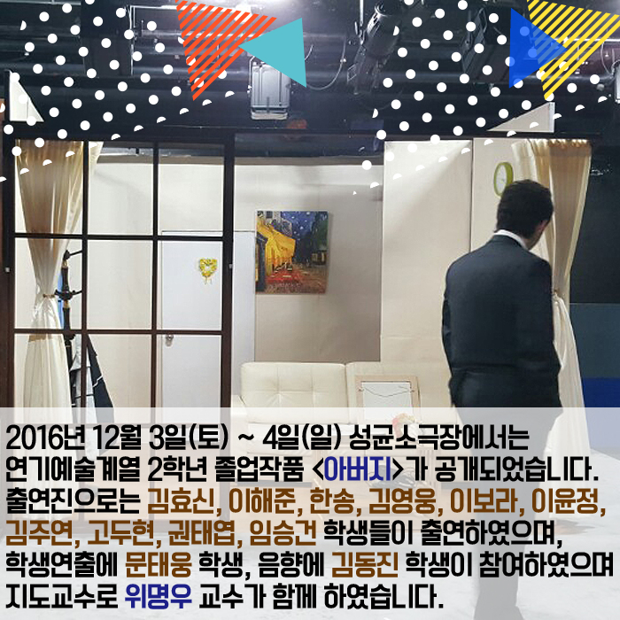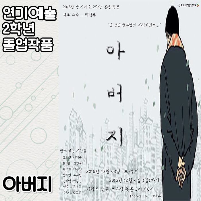 2016년 12월 3일(토) ~ 4일(일) 성균소극장에서 연기예술계열 2학년 학생들의 졸업작품 <아버지>가 공개되었습니다.
