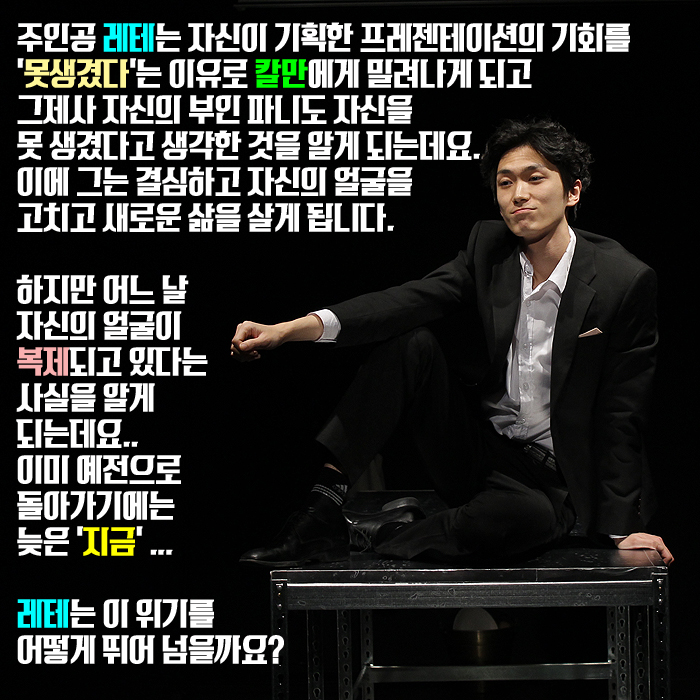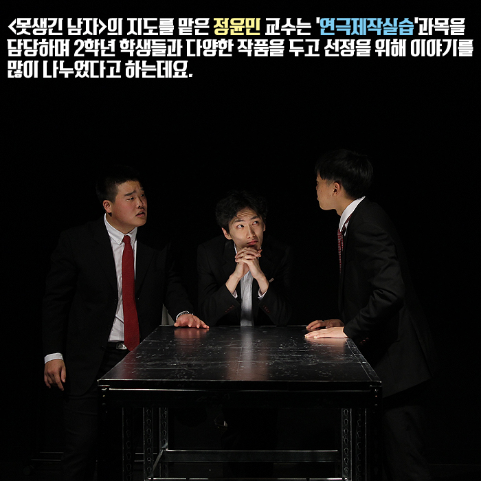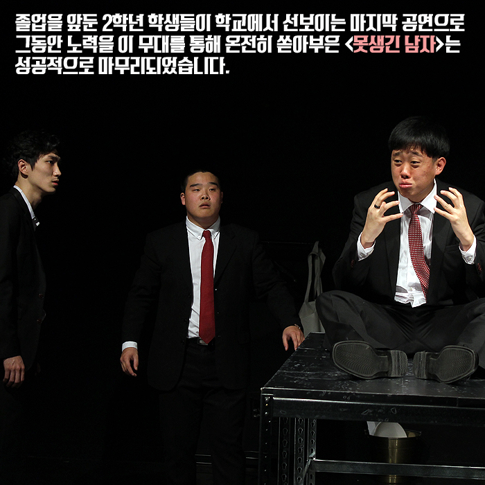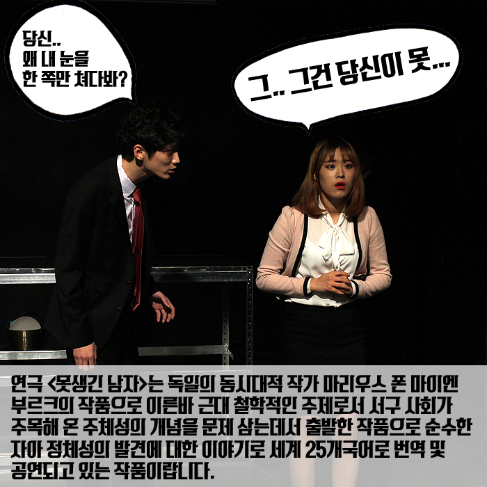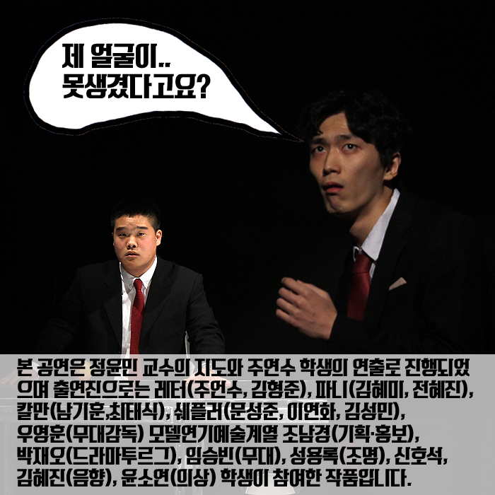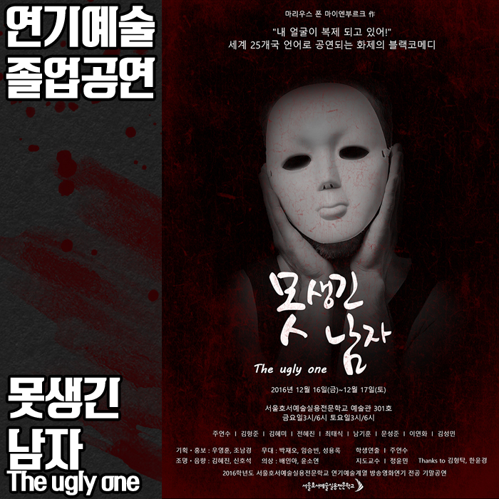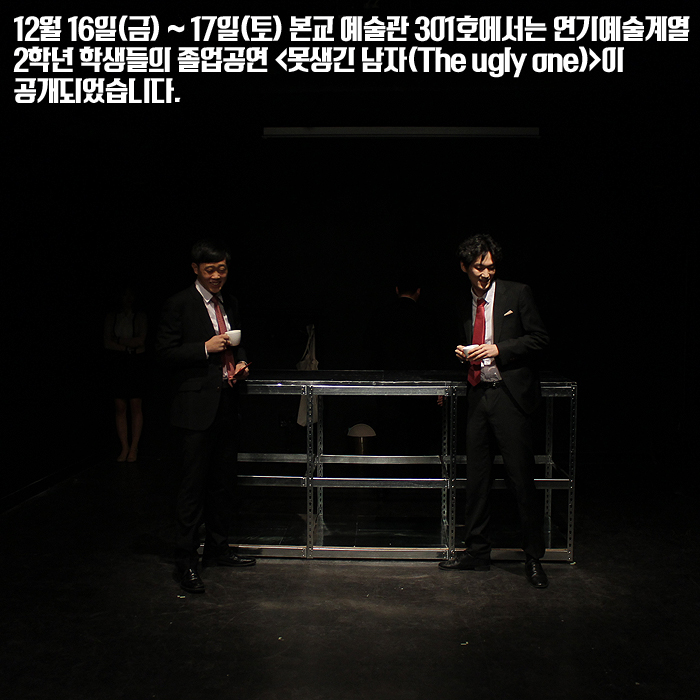 12월 16일(금) ~ 17일(토) 본교 예술관 301호에서는 연기예술계열 2학년 학생들의 졸업공연 <못생긴 남자(The ugly one)>이 공개되었습니다.