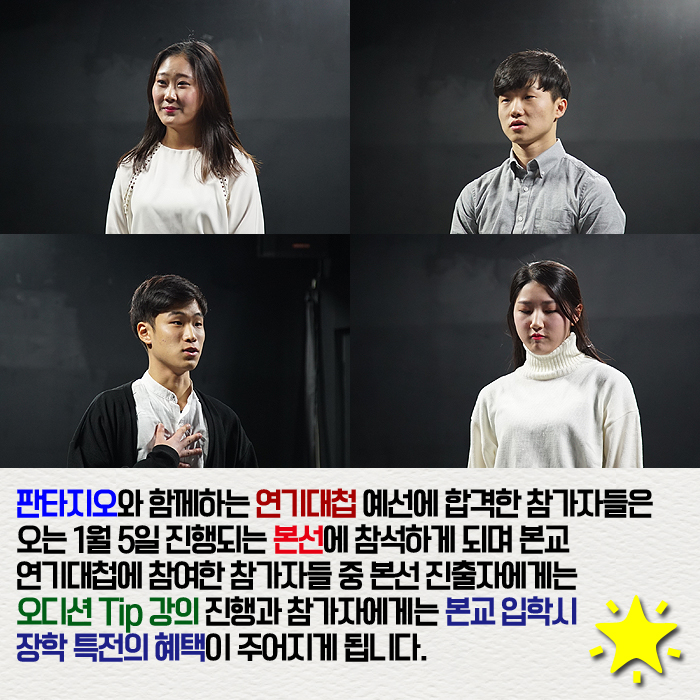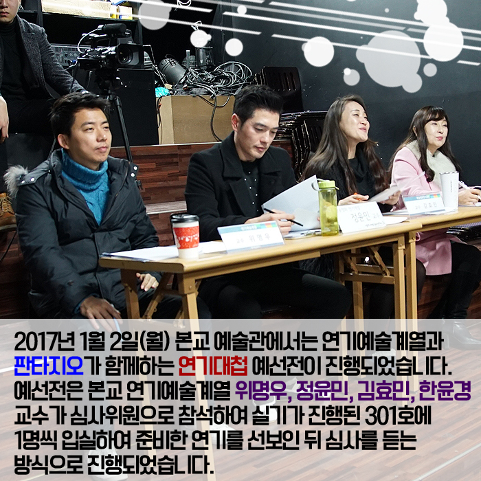 1월 2일(월) 본교에서는 연기예술계열과 판타지오가 함께하는 연기대첩 예선이 진행되었습니다.