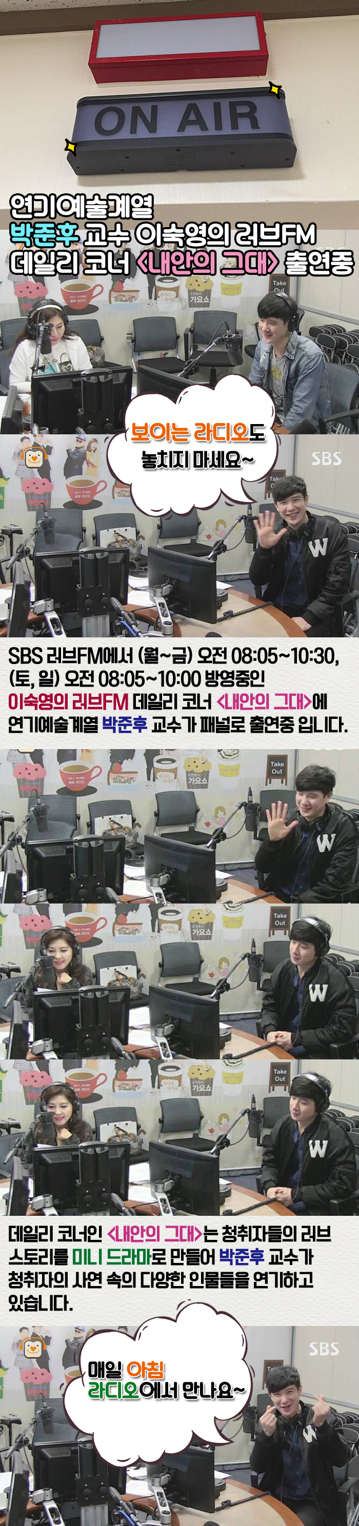 이숙영의 러브FM 데일리 코너 '내안의 그대'에 연기예술계열 박준후 교수가 패널로 출연중 입니다.