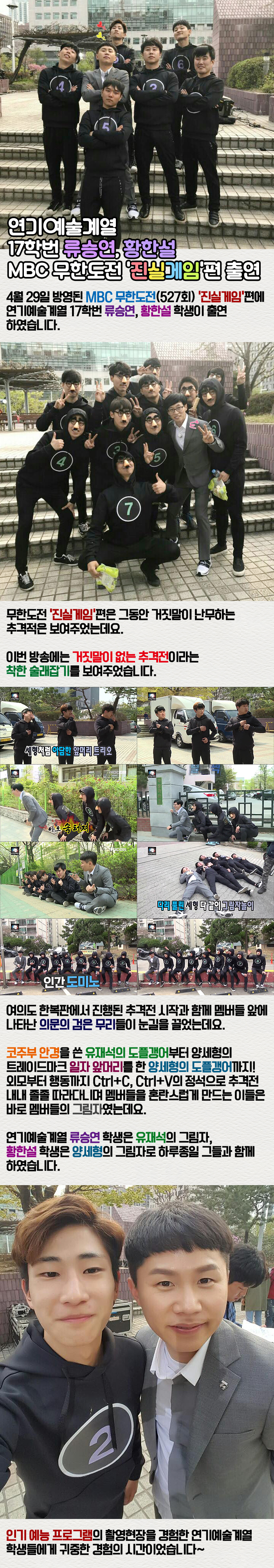 4월 29일 방영된 MBC 무한도전(527회) ‘진실게임’편에 연기예술계열 17학번 류승연, 황한설 학생이 출연하였습니다.