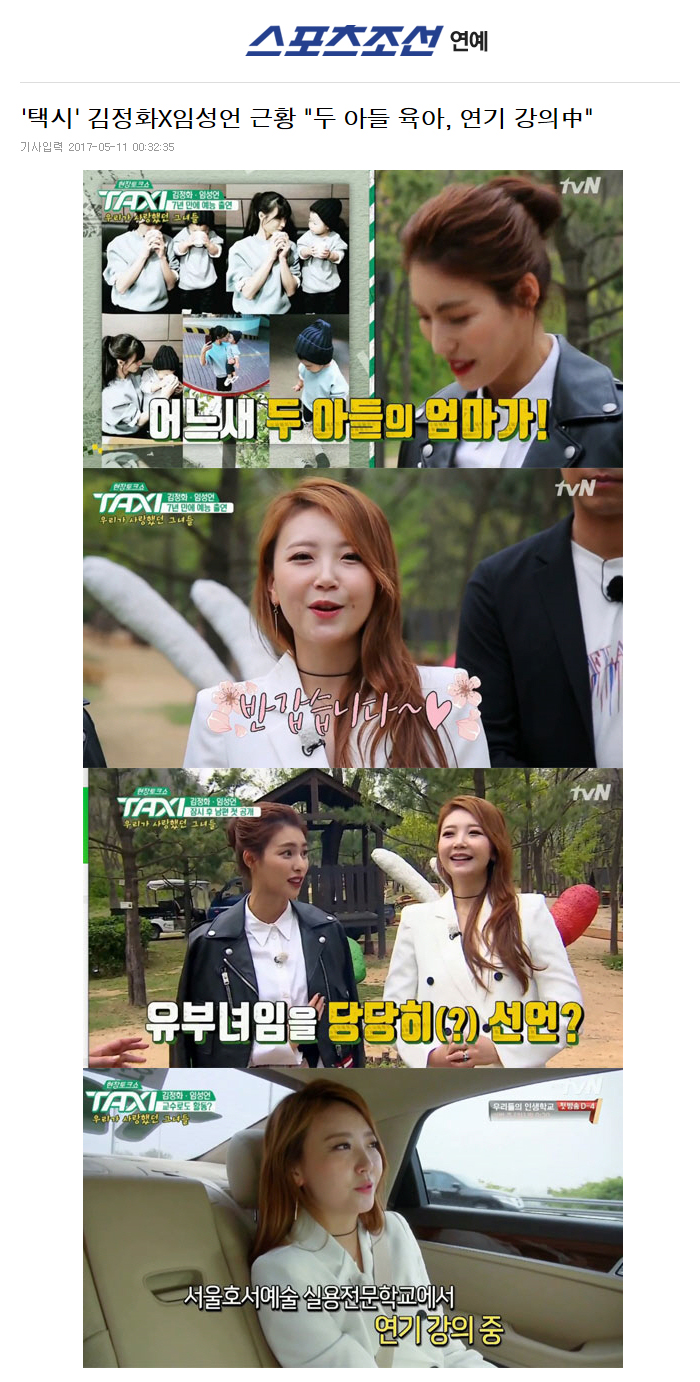 [스포츠조선 김영록 기자]'택시' 김정화와 임성언이 각각 육아와 강의로 바쁜 근황을 전했다.