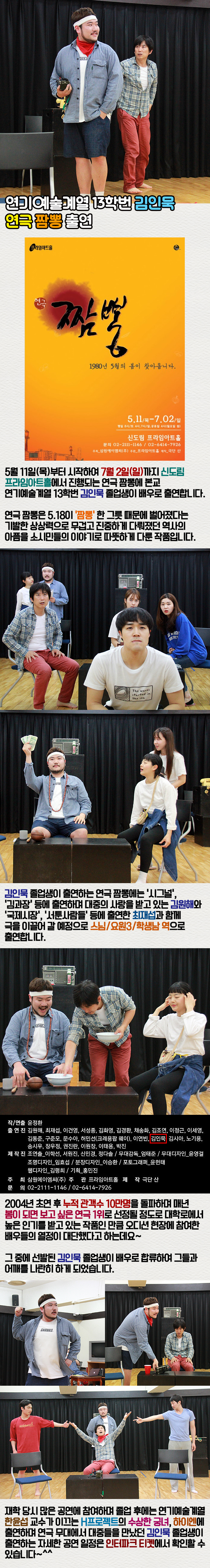 5월 11일(목)부터 시작하여 7월 2일(일)까지 신도림 프라임아트홀에서 진행되는 연극 짬뽕에 본교 연기예술계열 13학번 김인묵 졸업생이 배우로 출연합니다.