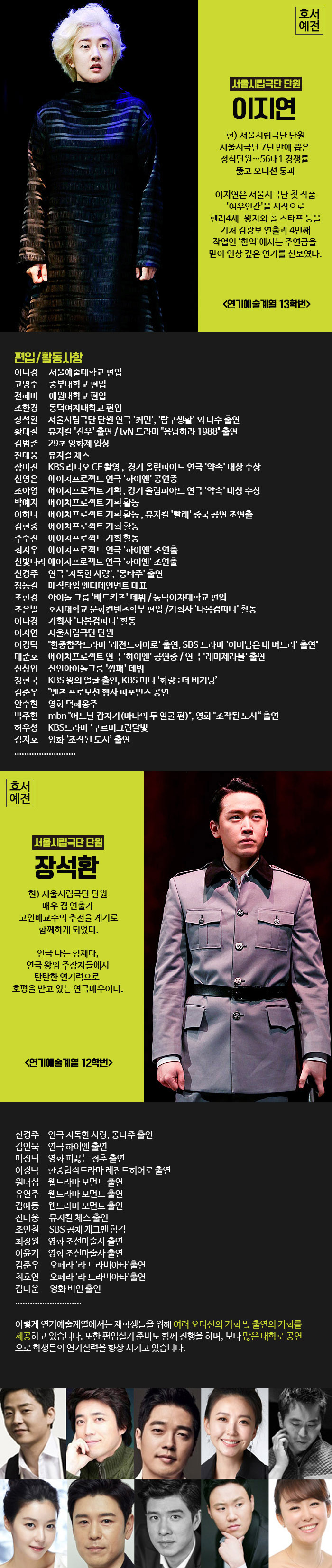 서울시립극단 이지연, 장석환부터, 영화 조작된도시에 출연한 김지호, 박주현 까지 연기예술 학생들의 활동 소식을 전해드립니다. 탄탄한 연기력을 바탕으로 가장 많은 공연을 하는 학교로 이슈가 되고 있는데요, 그만큼 실력있는 선배들의 활동도 후배들에게 많은 힘이 되어 줍니다.