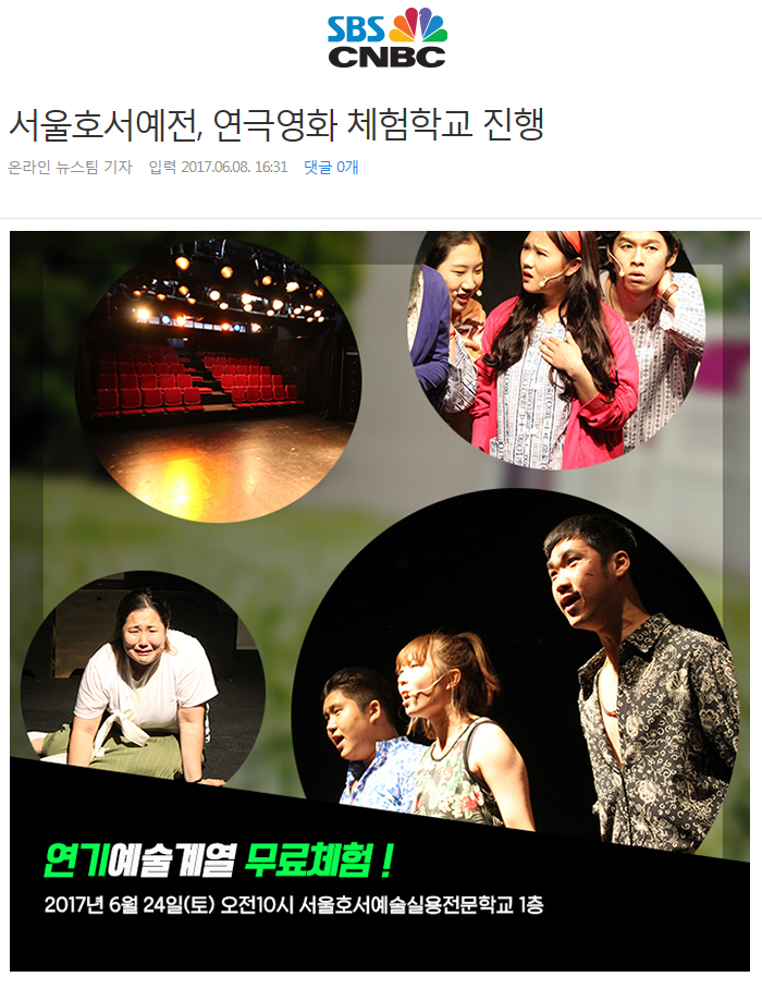 서울 강서구 가양동에 위치한 서울호서예술실용전문학교(이하 서울호서예전) 연극영화 과정에서는 오는 6월24일(토) 오전10시 예술관 소극장에서 무료체험학교를 진행한다.