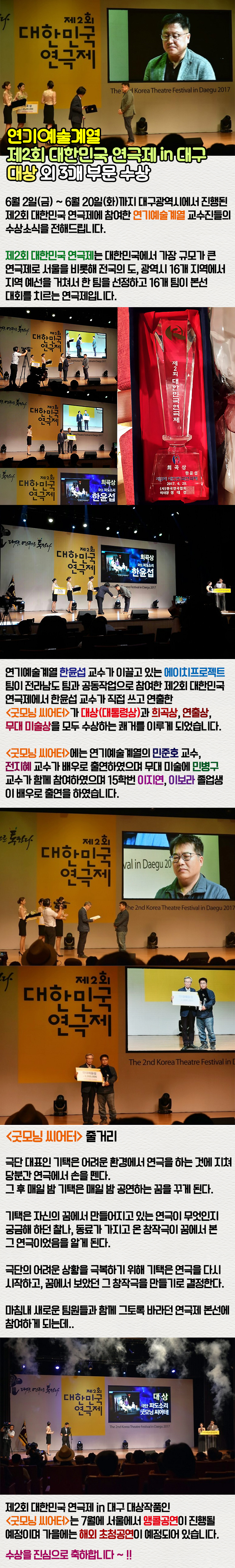 연기예술계열 한윤섭 교수가 이끌고 있는 에이치프로젝트 팀이 전라남도 팀과 공동작업으로 참여한 제2회 대한민국 연극제에서 한윤섭 교수가 쓰고, 연출을 함께 한 <굿모닝 씨어터>가 대상(대통령상)과 희곡상, 연출상, 무대 미술상을 모두 수상하는 쾌거를 이루게 되었습니다.