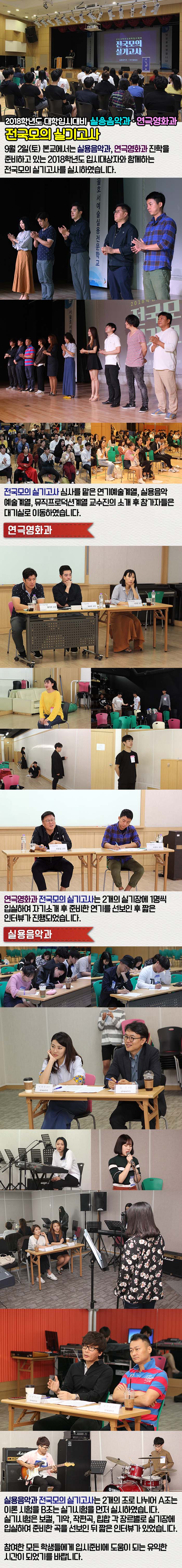 9월 2일(토) 본교에서는 실용음악과, 연극영화과 진학을 준비하고 있는 2018학년도 입시대상자와 함께하는 전국모의 실기고사를 실시하였습니다.