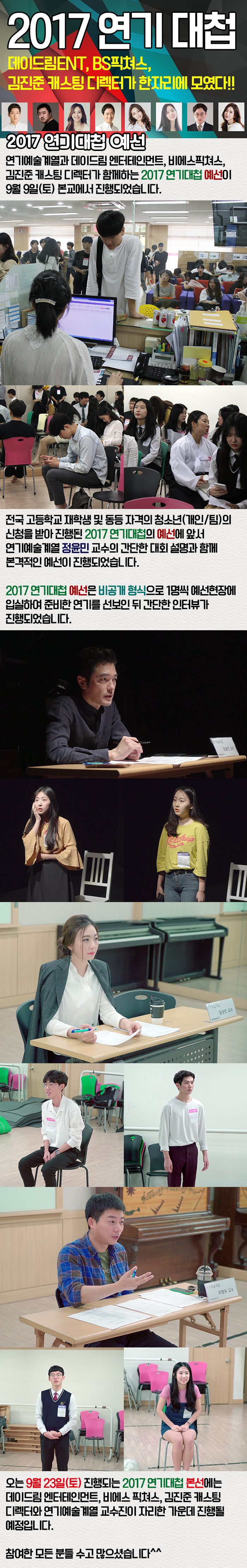 연기예술계열과 데이드림 엔터테인먼트, 비에스픽쳐스, 김진준 캐스팅 디렉터가 함께하는 2017 연기대첩 예선이 9월 9일(토) 본교에서 진행되었습니다.