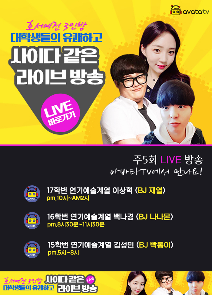 본교 연기예술계열 학생들의 유쾌하고 사이다 같은 라이브 방송 알고 계시나요? 아직 모르시는 분들을 위해 알려드립니다. 주5회 BJ재열, BJ나나몬, BJ빡통이가 아바타TV에서 라이브 방송을 합니다. 다함께~ 아바타TV에서 만나요!!
