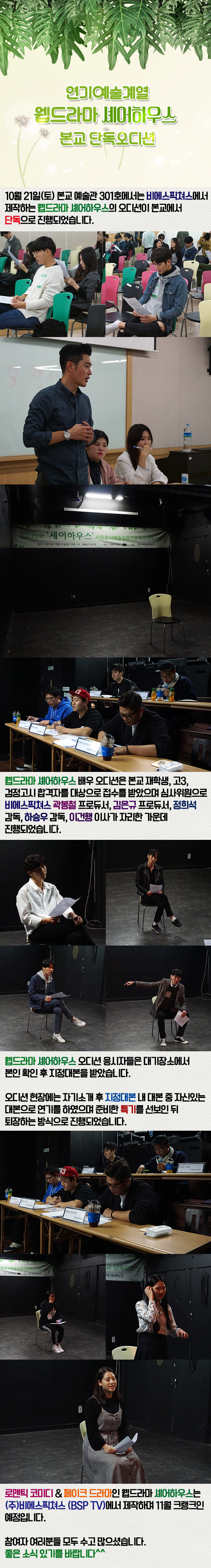 10월 21일(토) 본교 예술관 301호에서는 비에스픽쳐스에서 제작하는 웹드라마 셰어하우스의 오디션이 본교에서 단독으로 진행되었습니다.
