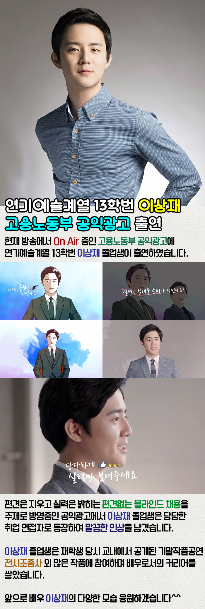 현재 방송에서 On Air 중인 고용노동부 공익광고에 연기예술계열 13학번 이상재 졸업생이 출연하였습니다.